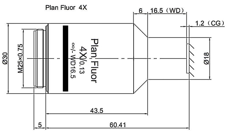 Plan Apochromatic Objective 4X, Optical System Characteristics Infinite Correction, Observation Method Bright Filed / Fluorescence, Level of Chromatic Aberration Correction Apochromatism, Focal Length 50MM, Field Number of The Objective 25MM, Numerical Aperture 0.2, Working Distance 20MM