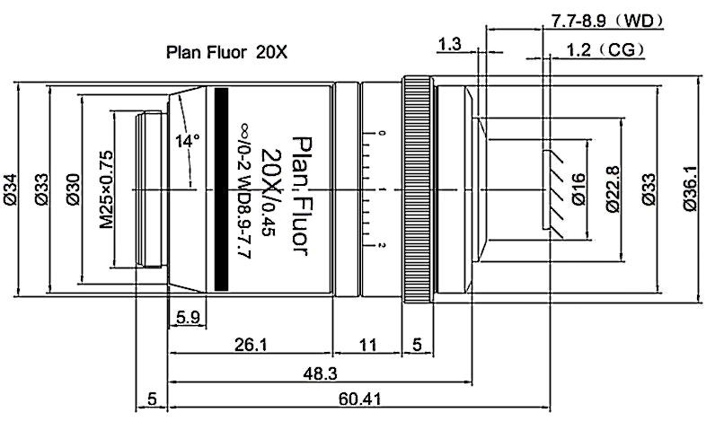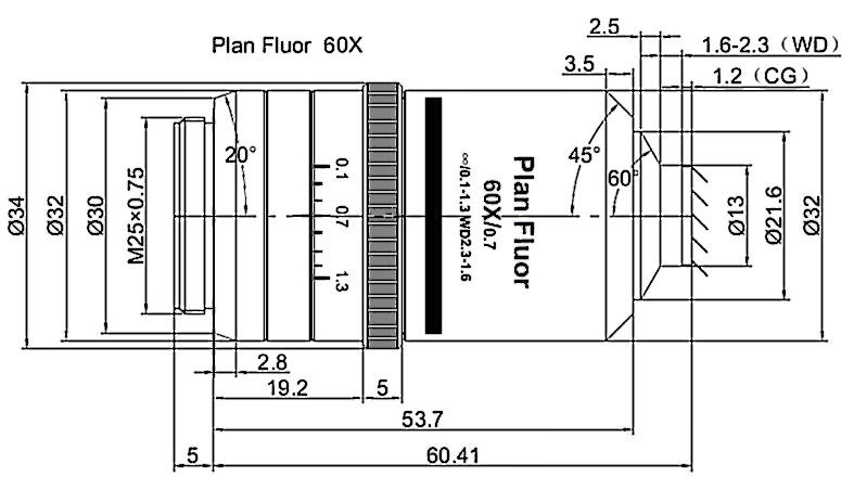 Plan Fluorite Objective 60X, Optical System Characteristics Infinite Correction, Observation Method Bright Filed / Fluorescence, Level of Chromatic Aberration Correction Semi-apochromatism, Focal Length 3.3MM, Numerical Aperture 0.7, Working Distance1.6-2.3MM, Cover Glass Thickness 0-2MM