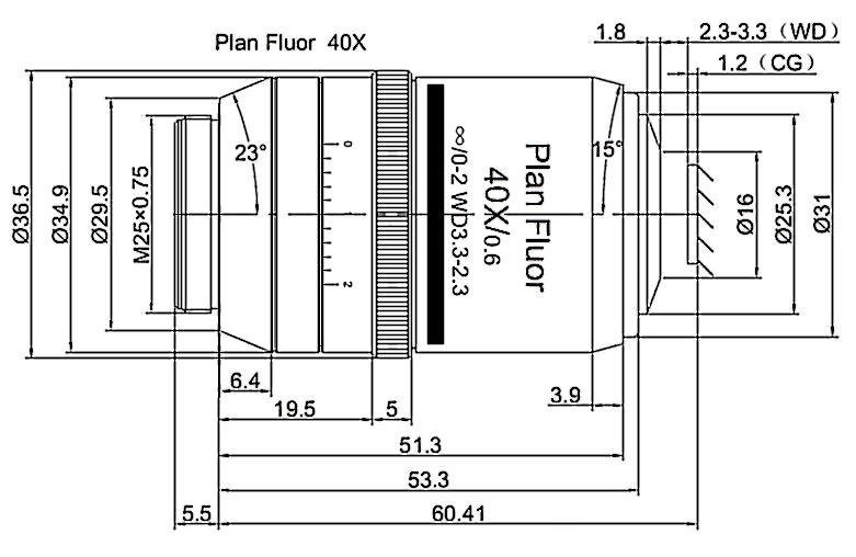 Plan Fluorite Objective 40X, Optical System Characteristics Infinite Correction, Observation Method Bright Filed / Fluorescence, Level of Chromatic Aberration Correction Semi-apochromatism, Focal Length 5MM, Numerical Aperture 0.6, Working Distance2.3-3.3MM, Cover Glass Thickness 0-2MM