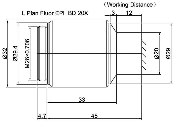 Long Working Distance Plan Fluorite Objective Episcopic Coaxial Illumination Bright and Dark Field 20X, Optical System Characteristics Infinite Correction, Observation Method Bright Field / Dark Field, Level of Chromatic Aberration Correction Semi-apochromatism, Focal Length 10MM, Numerical Aperture 0.4, Working Distance 12MM, Field Number of The Objective 25MM, Resolution 0.7um, Depth of Focus 1.7um