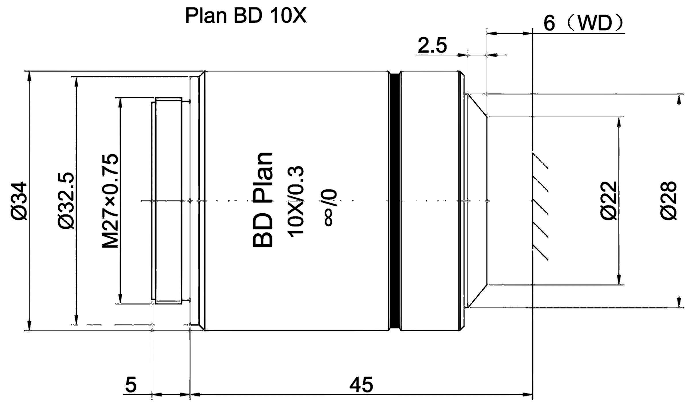 Plan Objective Bright and Dark Field 10X, Optical System Characteristics Infinite Correction, Observation Method Bright Field / Dark Field, Level of Chromatic Aberration Correction Achromatism, Focal Length 20MM, Numerical Aperture 0.3, Working Distance 6MM, Field Number of The Objective 25MM, Resolution 0.9um, Depth of Focus 3.1um
