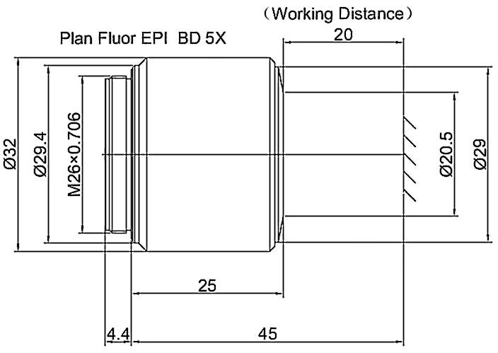 Plan Fluorite Objective Episcopic Coaxial Illumination Bright and Dark Field 5X, Optical System Characteristics Infinite Correction, Observation Method Bright Field / Dark Field, Level of Chromatic Aberration Correction Semi-apochromatism, Focal Length 40MM, Numerical Aperture 0.15, Working Distance 20MM, Field Number of The Objective 25MM, Resolution 1.8um, Depth of Focus 12um